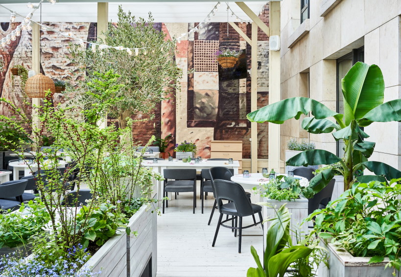 Рестораны Аркадия Новикова делят не только здание в Ковенском переулке, но и просторную летнюю террасу на 160 посадочных мест. К новому сезону пространство дополнительно озеленили, посадив там вербену, петунью, герань, тимьян и мяту. Еще одно достоинство веранды — вид на большой мурал во дворе дома. Петербургские художники изобразили на стенах целый город.