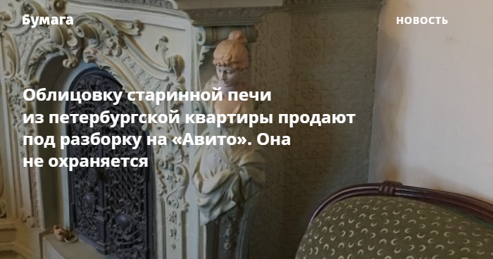 На сайте «Авито» появилось объявление о продаже керамической облицовки старинной печи, расположенной в одном из домов Центрального района Петербурга. Внимание на это обратил активист Ярослав Костров.