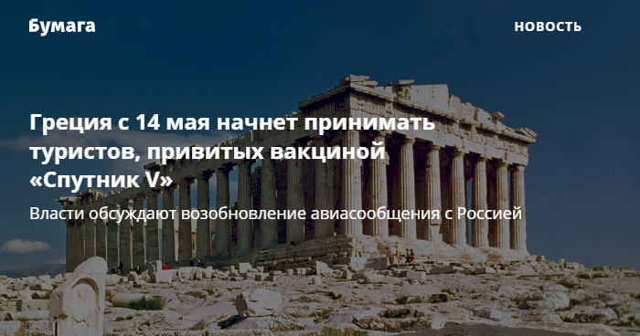 Греция с 14 мая начнет принимать туристов, привитых вакциной «Спутник V». Власти обсуждают возобновление авиасообщения с Россией