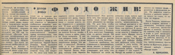 Увлёкшись произведениями Толкина, Юлия изучила доступные ей материалы по его творчеству и под псевдонимом А. Щербакова опубликовала в декабре 1980 года в пермской молодёжной газете «Молодая Гвардия» заметку «Фродо жив!» (лозунг-граффити сторонников контркультуры 1960-х годов — прим. TJ). Впоследствии статья попала через московских работников самиздата в музей Толкина, существующий при компании Tolkien Estate, как первое упоминание «Властелина колец» в советской прессе — за два года до выхода первого официального перевода Кистяковского-Муравьёва на русском языке.