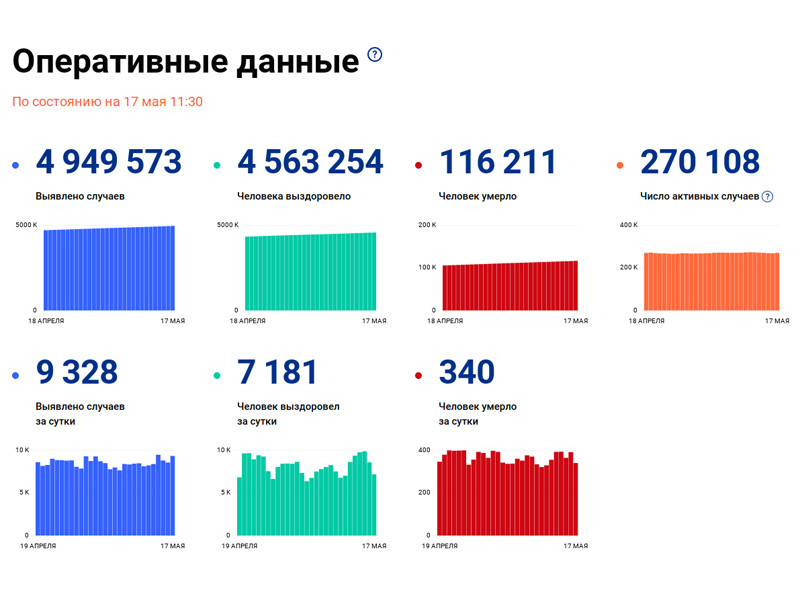 Число летальных исходов из-за коронавируса возросло за сутки на 340 против 391 днем ранее. Всего с начала пандемии от инфекции умерли 116 211 человек. Условная летальность (окончательную можно будет определить только после завершения эпидемии) осталась на уровне 2,35%.