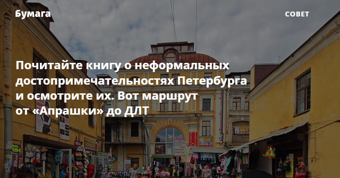 В справочнике собраны более 200 интересных мест в разных районах города — их хватит не на одну прогулку. Мы же предлагаем вам пройтись по самому центру Петербурга: от беспокойного Апраксина двора с дешевыми лавками и аутентичной азиатской едой до ДЛТ, крупного универмага дореволюционной постройки. По пути вы увидите Банковский мост с крылатыми львами, модернистский дом Зингера и Петрикирхе — действующую лютеранскую церковь, которую в советское время перепрофилировали под плавательный бассейн. Перекусить можно в упомянутой уже кофейне Bonch или в митерии Chuck: если вы голодны, закажите один из лучших стейков в городе, а если нет — ограничьтесь чизкейком с беконом.