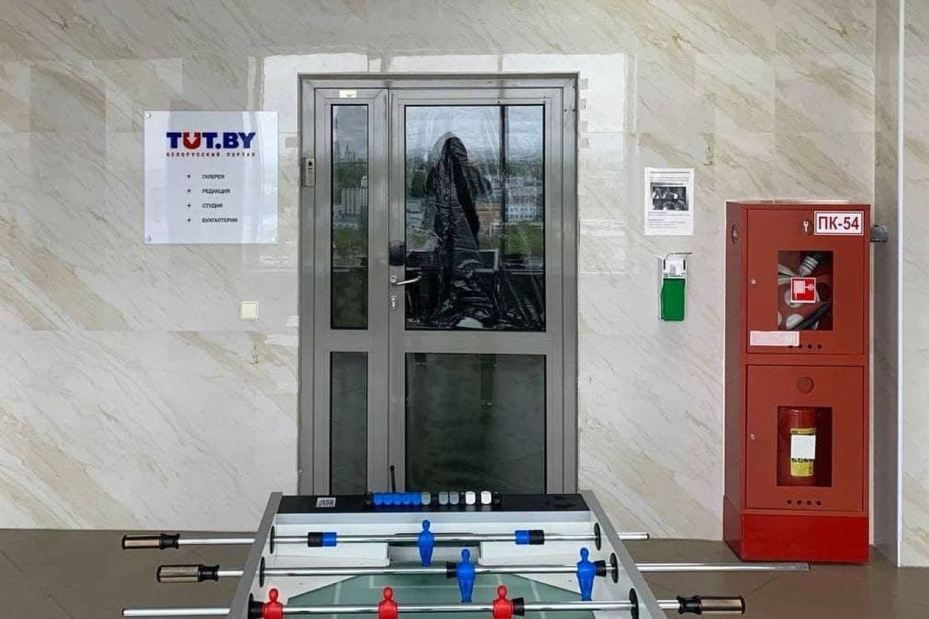 Security officers also arrived at the Tut.by newsroom, after which the journalists on the premises stopped answering their phones. The glass door leading to the newsroom was covered over with black plastic. Several other Tut.by journalists and photographers who arrived at the office after the raid began also stopped answering their phones.