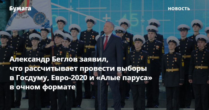Губернатор Петербурга Александр Беглов рассчитывает провести в очном формате грядущие массовые мероприятия, в том числе ПМЭФ, Евро-2020, День города, «Алые паруса», а также выборы в Госдуму и Законодательное собрание. Об этом он заявил на правительственном заседании 18 мая.