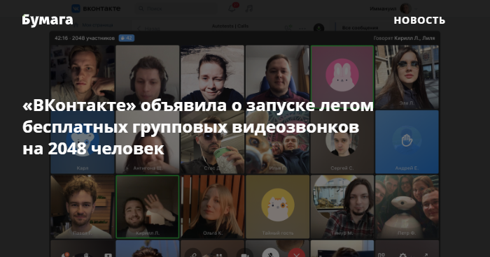 Летом 2021 года «ВКонтакте» запустит бесплатные групповые видеозвонки на 2048 человек одновременно. Об этом сообщил технический директор социальной сети Александр Тоболь.