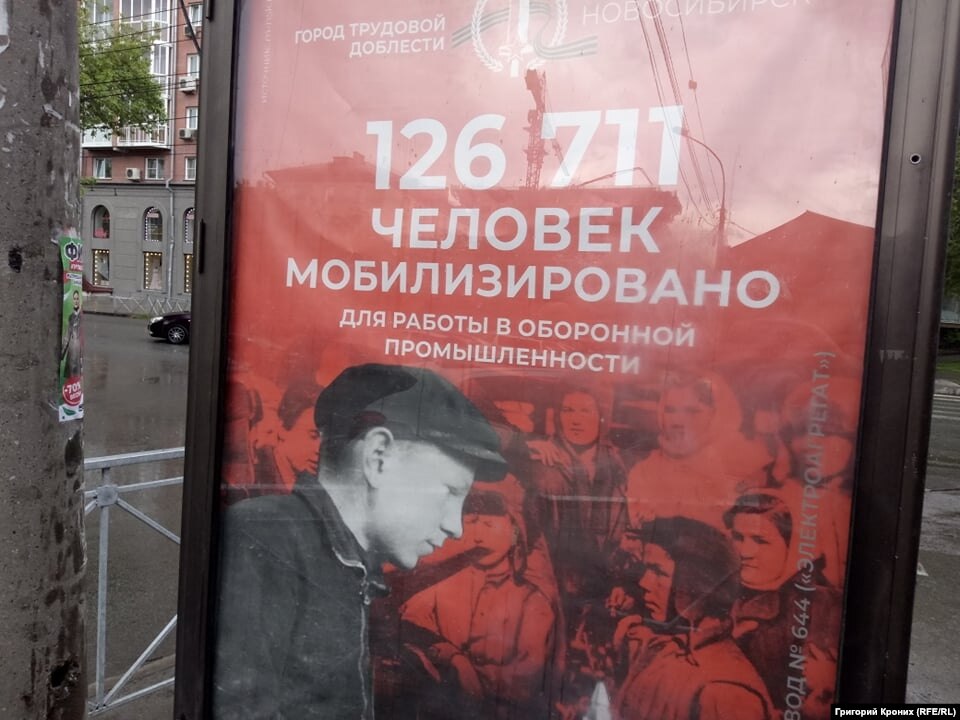 На одном из баннеров, где сообщается о количестве аппаратов связи, собранных в Новосибирске в годы Великой Отечественной войны, написано "изготовленно". На втором плакате "мобилизировано" вместо "мобилизовано": "126711 человек мобилизировано для работы в оборонной промышленности".