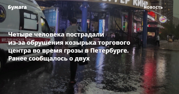 При обрушении козырька торгового центра на проспекте Испытателей вечером 18 мая пострадали четыре человека, а не два, как сообщалось ранее. Об этом рассказали в ГУ МЧС по Петербургу.