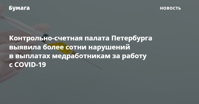 Контрольно-счетная палата Петербурга в ходе проверки обнаружила более сотни нарушений в выплатах медработникам, которые оказывают помощь людям с COVID-19. Об этом сообщается в отчете ведомства за 2020 год.