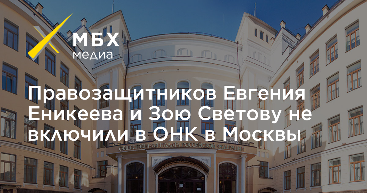 Общественная палата России в процессе донабора отказалась включить правозащитников Евгения Еникеева и Зою Светову в Общественную наблюдательную комиссию (ОНК) Москвы. Об этом «МБХ медиа» сообщили в пресс-службе палаты.