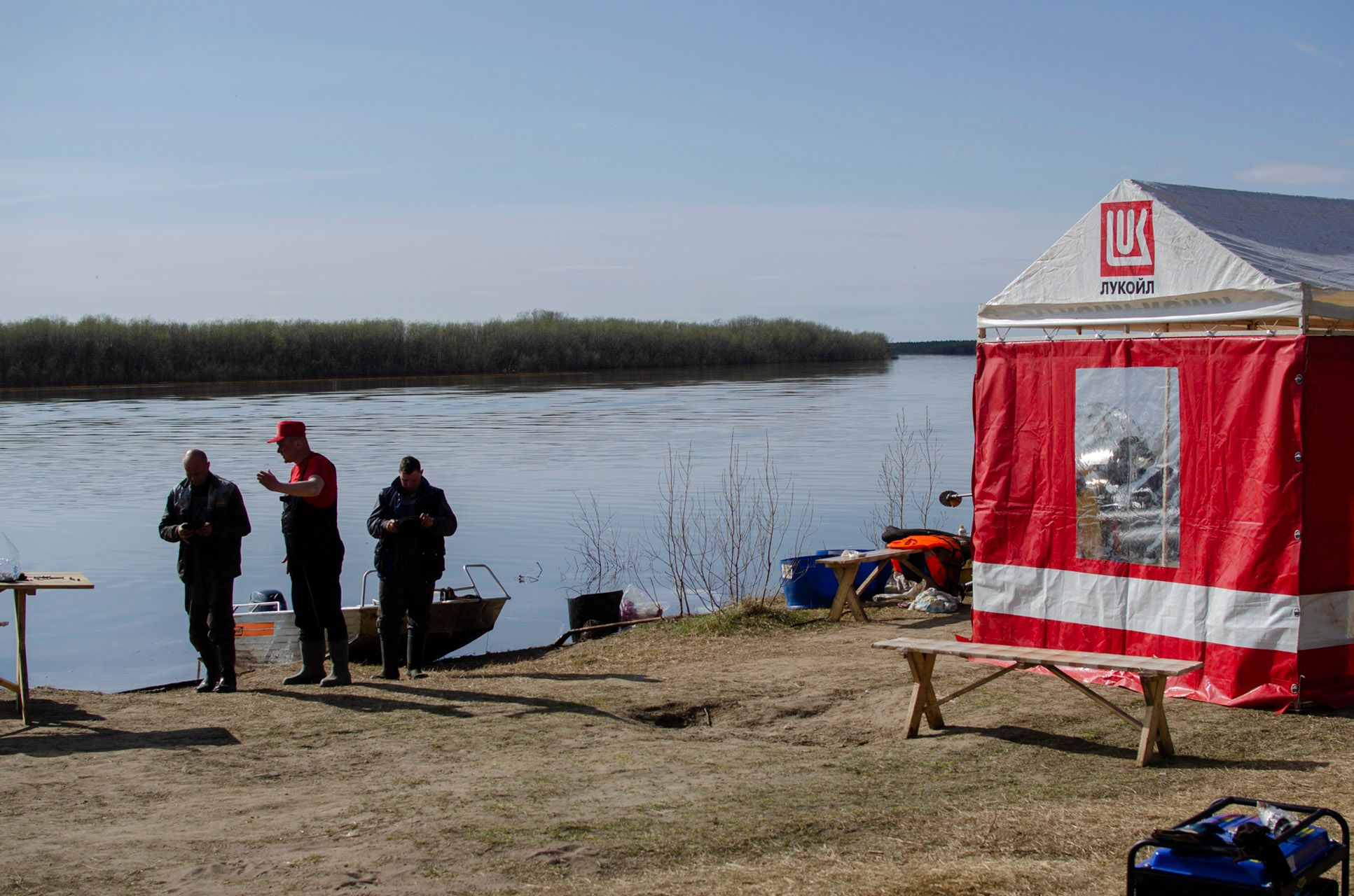 Жители Колвы то и дело выходят на берег реки. Отсюда отлично видна небольшая красно-белая палатка с логотипом «Лукойла», возле которой стоят белые канистры. Вокруг суетятся люди.
