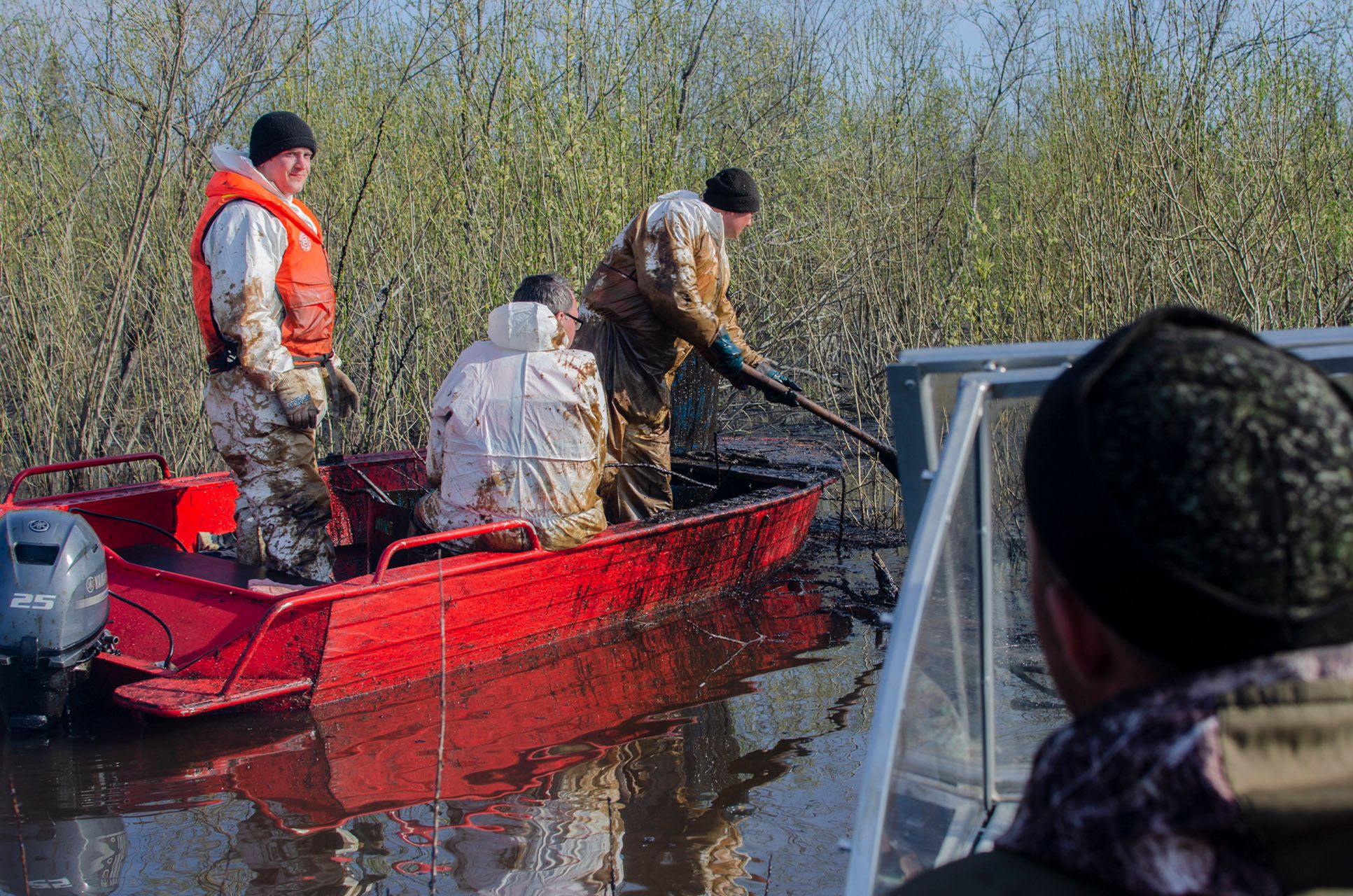 В километре от села ниже по течению расположился полевой штаб по ликвидации ЧС. К высокому седому мужчине в сером комбинезоне иногда подходят рабочие. Водители самосвалов бойко отчитываются, что привезли оборудование, и спрашивают, куда его выгружать. Лодочники сообщают о количестве «полубочек» с собранной нефтью.