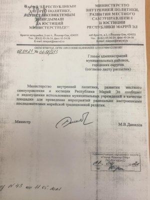 Министр внутренней политики Марий Эл Михаил Данилов разослал сообщения главам администраций муниципальных районов. В рассылке чиновник запретил предоставлять муниципальные площадки для «радикально» настроенных последователей марийской традиционной религии. Об этом сообщает «Idel.Реалии» со ссылкой на сайт «MariUver»