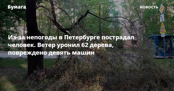 Из-за непогоды в Петербурге пострадал человек. Ветер уронил 62 дерева, повреждено девять машин