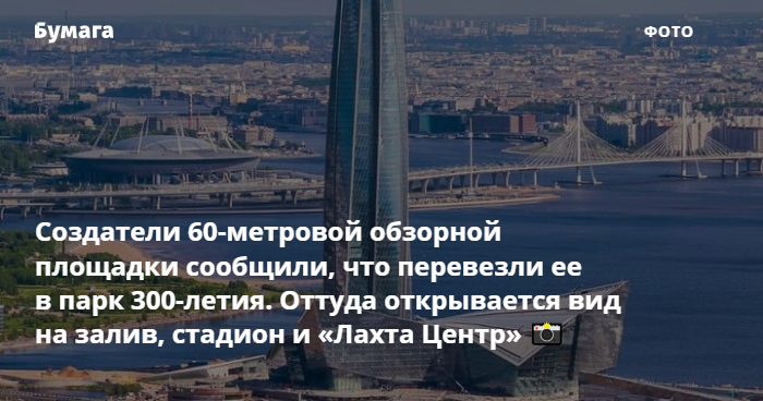 «Бумага» публиковала десять фотографий с 60-метровой обзорной площадки, когда она располагалась на площади Лихачева. После этого ее пришлось перенести. Причины не уточнили — организаторы сообщают лишь, что переезд не связан с техническими неполадками.
