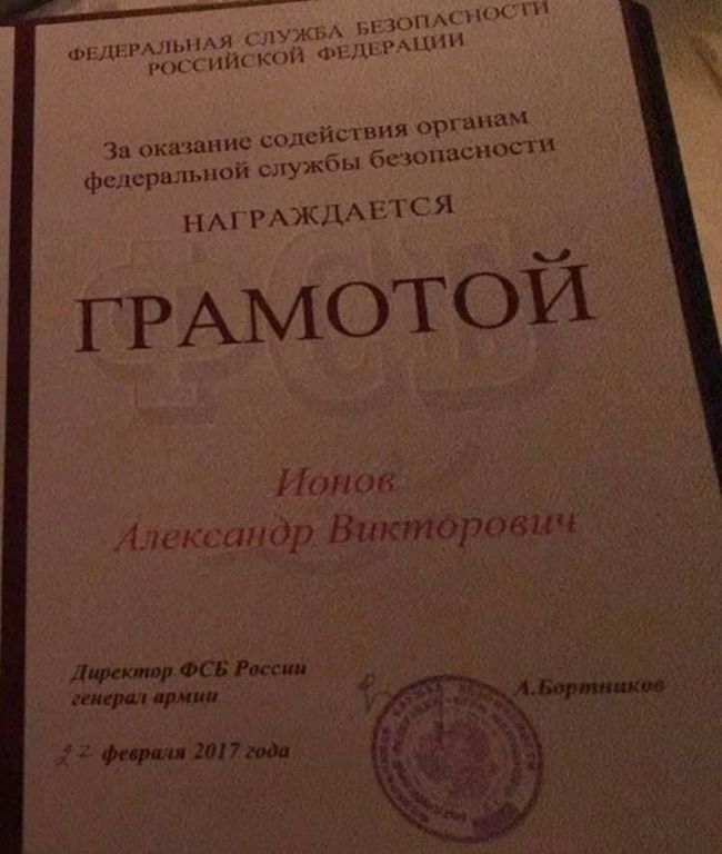 Alexander Ionov has a certificate of merit “For providing assistance to the bodies of the Federal Security Service” — it’s dated February 27, 2017, and signed by FSB Director Alexander Bortnikov himself.