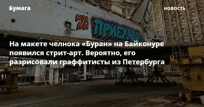 Макет космического челнока «Буран», находящийся в монтажно-заправочном комплексе Байконура, разрисовали уличные художники. Один из них рассказал об этом в инстаграм, но позже удалил пост. Как сообщает 78.ru и Znak.com, это был петербургский граффитист с ником Burda.dobro, участник команды DobroCrew.