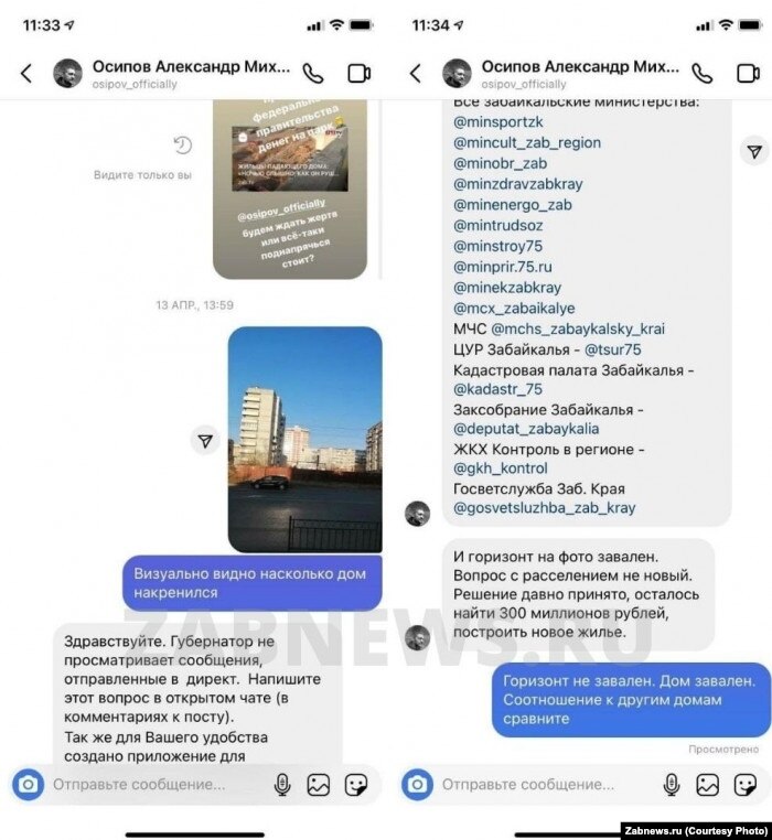 Житель Читы пожаловался на ситуацию с расселением его аварийного дома губернатору Александру Осипову в инстаграме. На фото видно, что дом сильно накренился. Сотрудники пресс-службы ответили жителю, что это не дом наклонен, а "горизонт завален". Об этом сообщило издание Zabnews.ru.