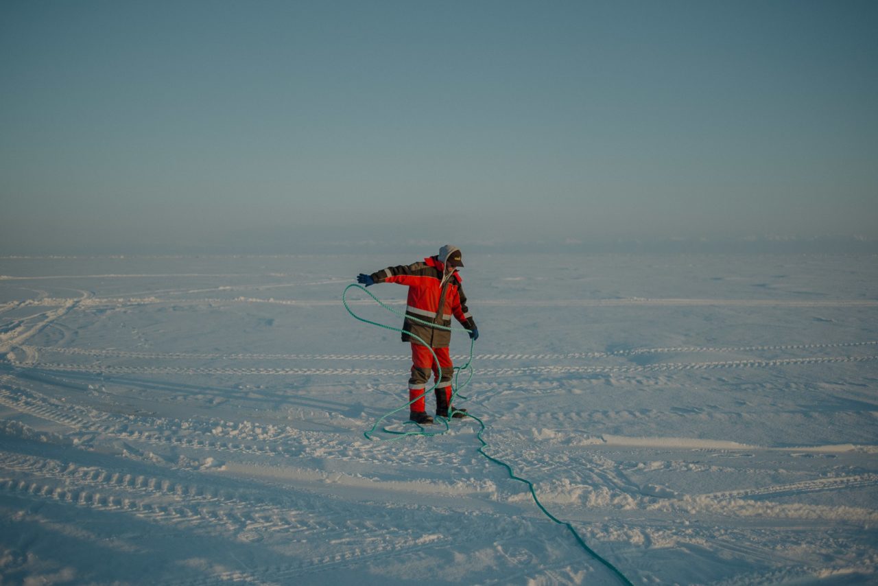 Научный сотрудник разматывает канатФото: Сергей Карпов / Поле для ТД ФЭУ ловят в байкальской воде нейтрино — мельчайшие частицы, которые летят через Вселенную и пролетают сквозь нашу планету. Всего под байкальской водой 88 тросов, на которых размещается почти 10 тысяч приборов.