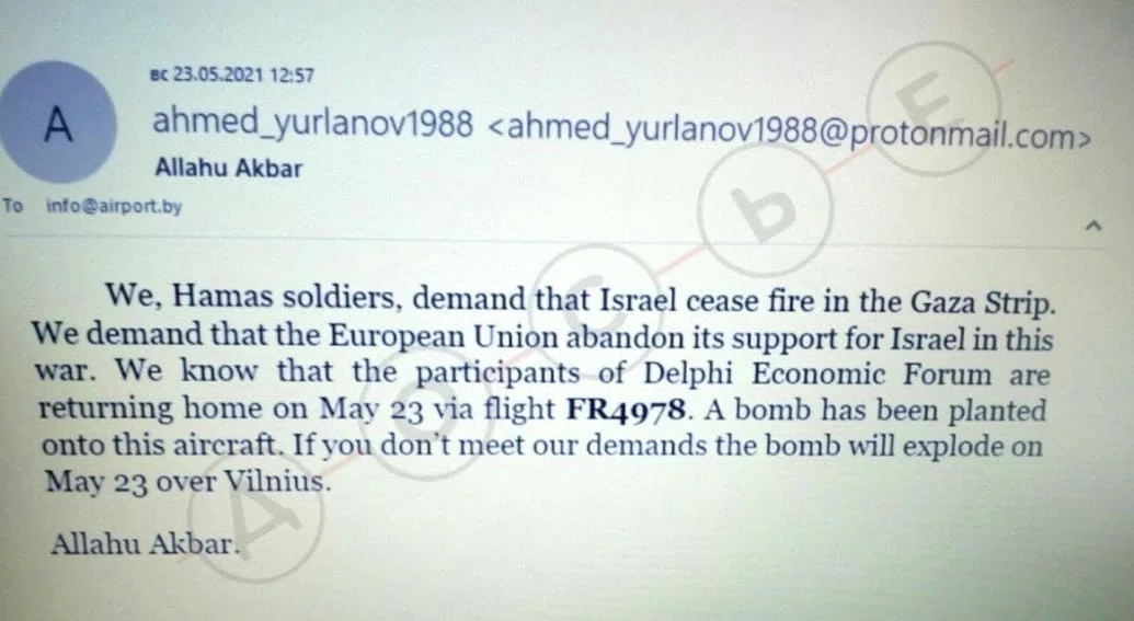 Письмо о готовящемся взрыве на борту самолета Ryanair, на котором из Афин в Вильнюс летел бывший редактор NEXTA Роман Протасевич, поступило в аэропорт через 27 минут после того, как белорусские диспетчеры сообщили о нем пилотам рейса. Об этом сообщает Der Spiegel со ссылкой на результаты расследования лондонского центра «Досье».