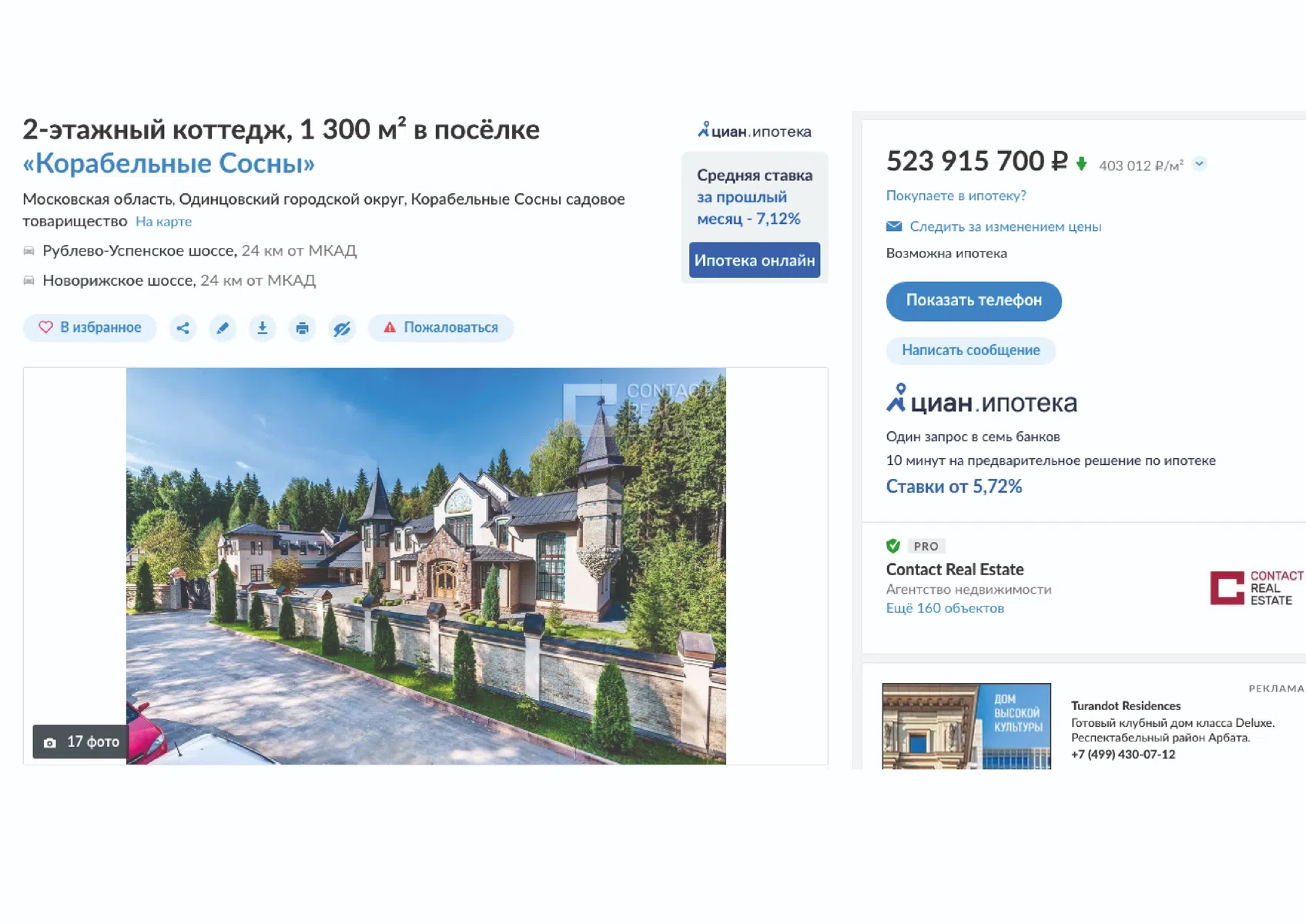 Домовладение в коттеджном поселке «Корабельные сосны» площадью 1,3 тысячи кв. м стоимостью 523 млн рублей. Коттедж Скрынник еще больше —2,1 тыс. кв. м.