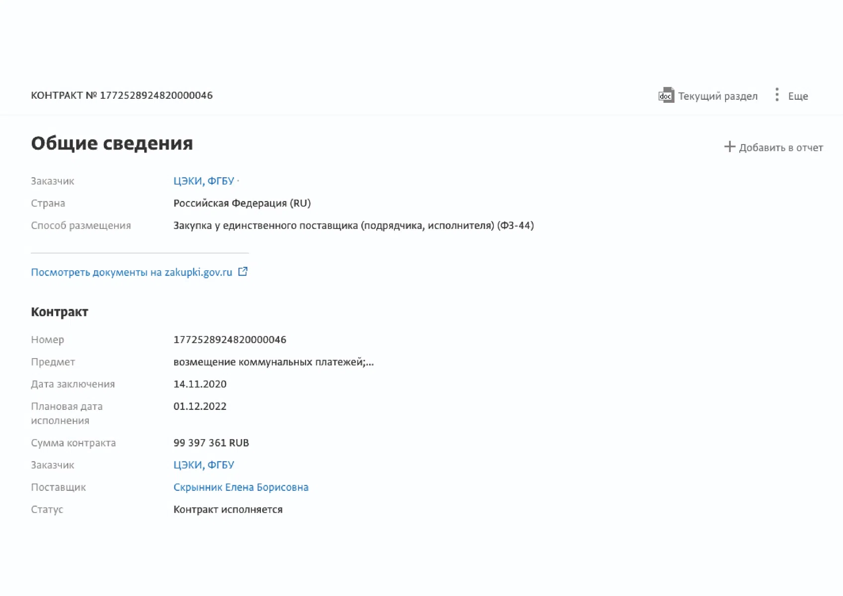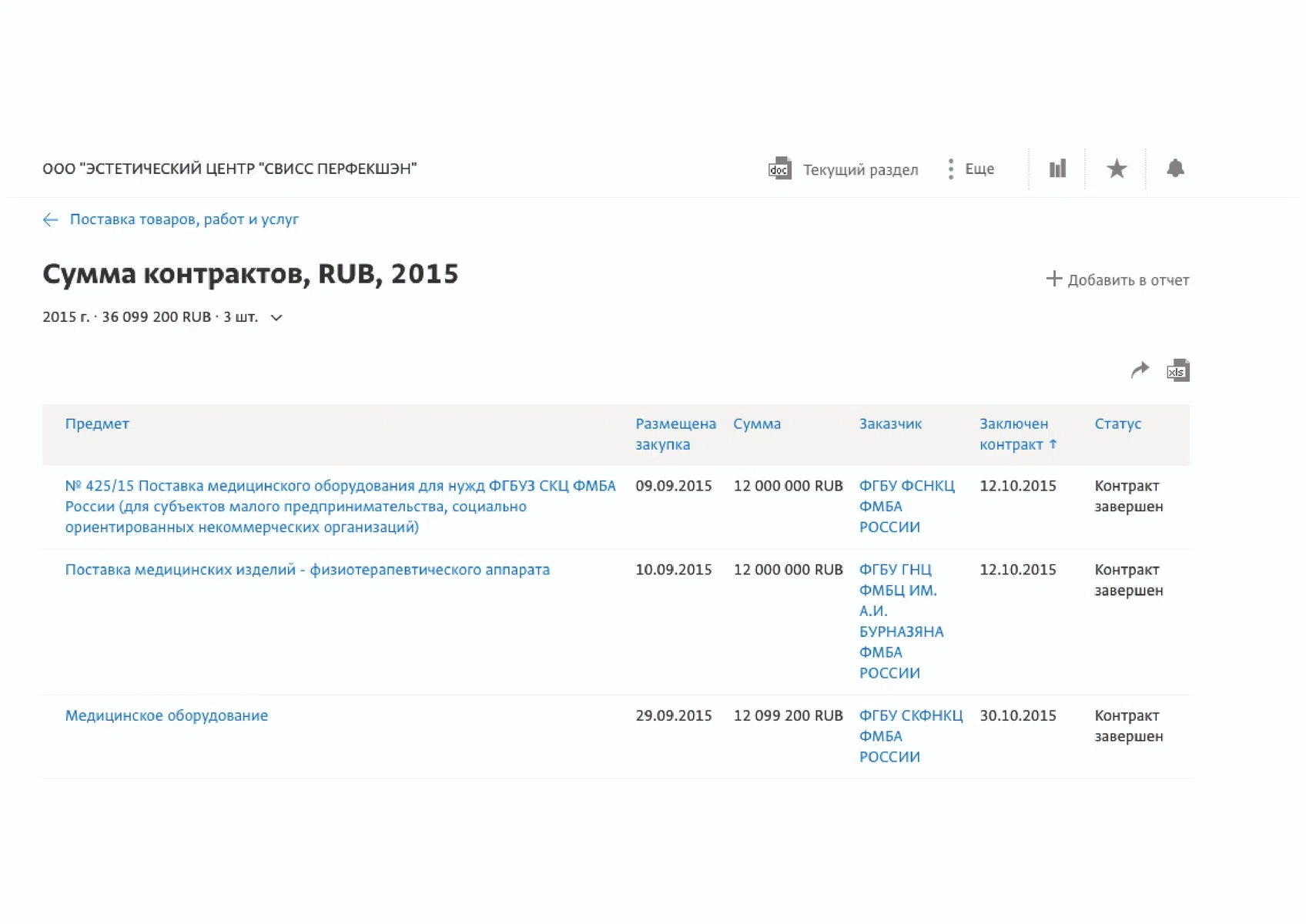 Все контракты, за исключением одного, достались фирмам Скрынник от Федерального медико-биологического агентства (ФМБА), подведомственного правительству России и его структурам: ФГБУЗ «Медицинский центр «Юность», ФГБУ «Федеральный сибирский научно-клинический центра» Федеральный медицинский биофизический центр имени А.И. Бурназяна. И один контракт — от Минздрава.