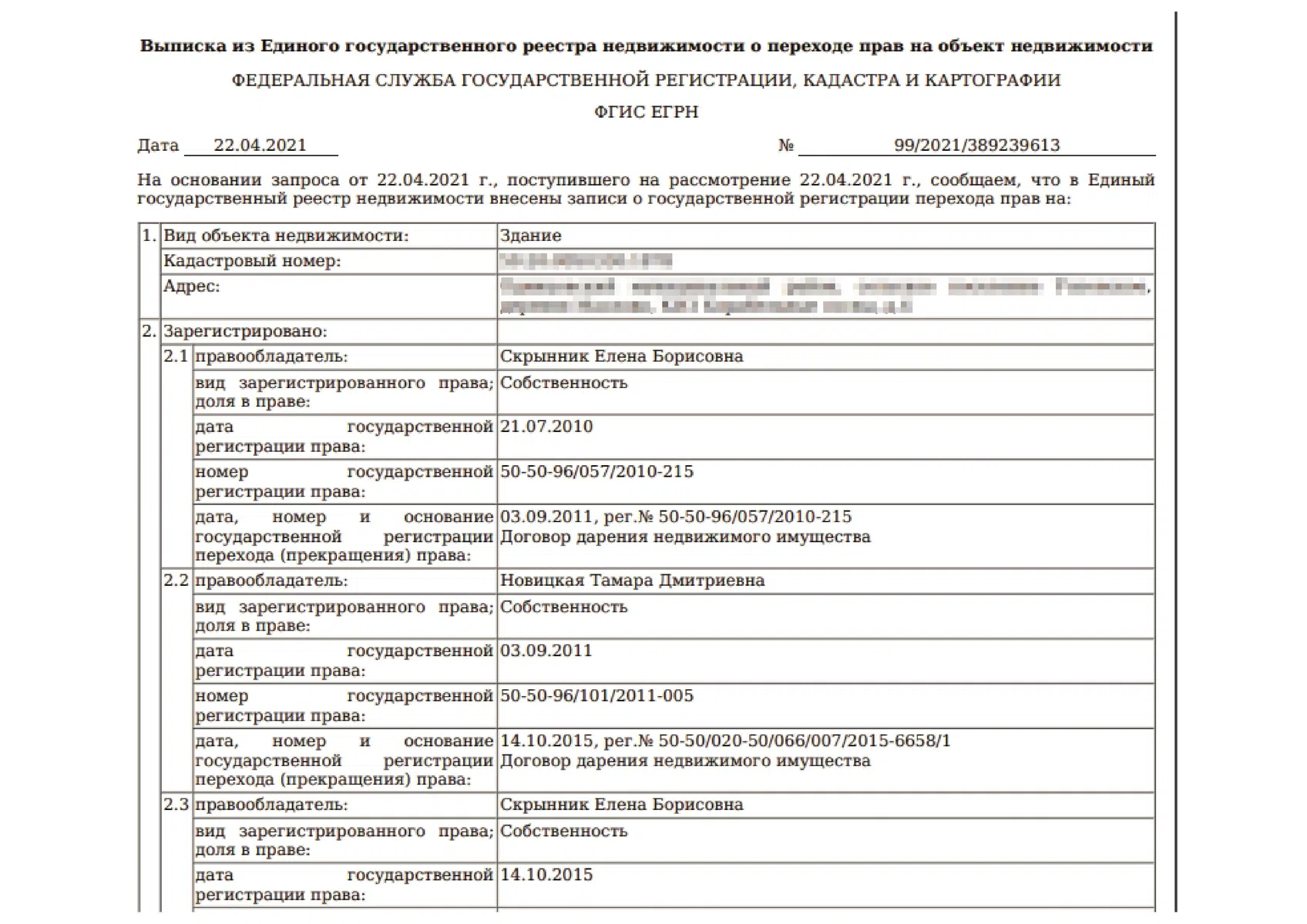 Домовладение в коттеджном поселке с 2011 года принадлежало матери Елены Скрынник, но в октябре 2015-го Елена Борисовна переоформила поместье на себя. Выписка из Единого государственного реестра недвижимости