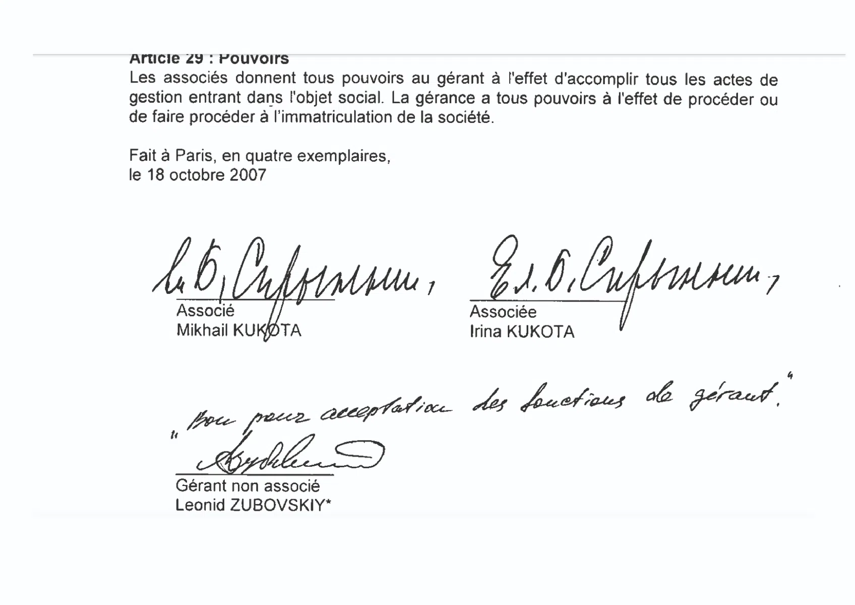 Выписки из французского реестра юридических лиц о создании фирмы Sci Anastasia человеком по имени Елена и фамилии Скрынник от имении малолетних Михаила Кукоты и Ирины Кукоты