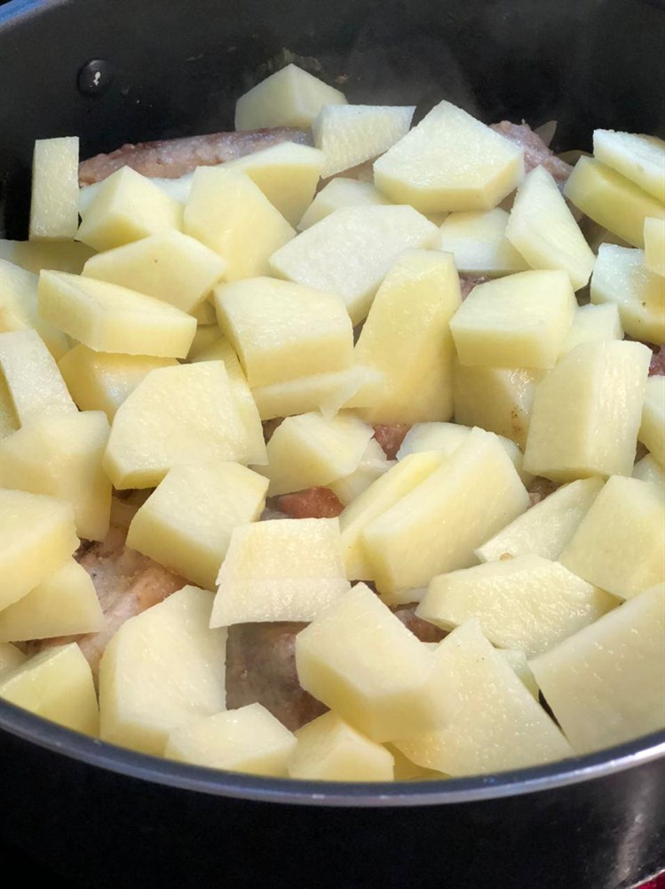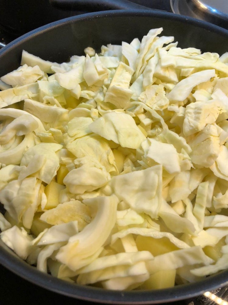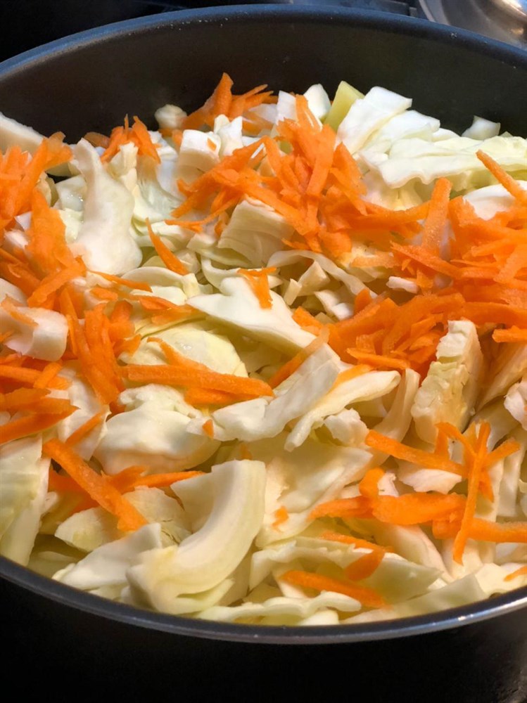 Затем добавим нарезанный картофель, капусту и морковь. Зальем небольшим количеством воды и немного потушим на медленном огне.
