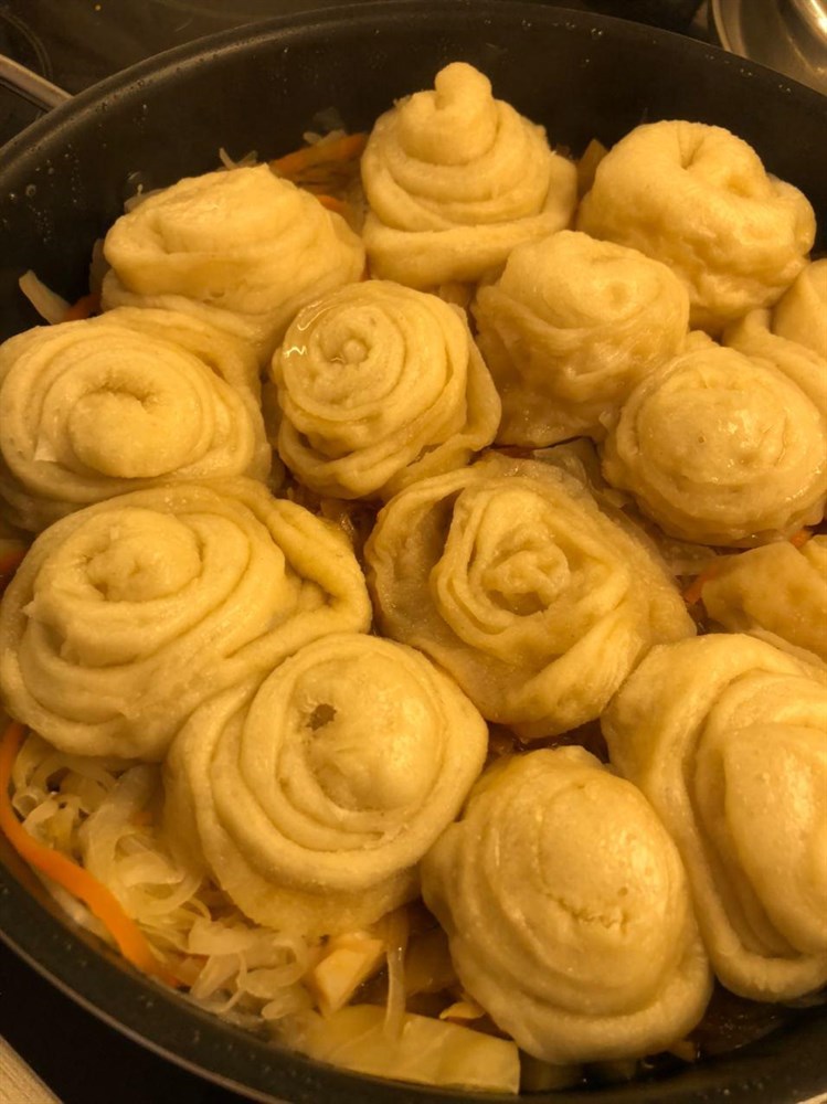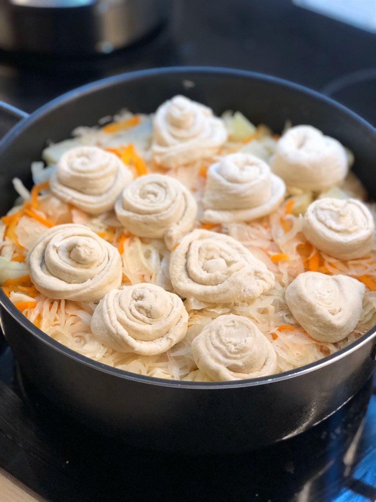 На капусту положим подготовленные штрудли, закроем плотно крышкой (накрытой изнутри полотенцем) и, выдержав на сильном огне минут 3-4, уменьшим огонь. Готовим на медленном огне минут 40. Крышку не открываем, чтобы не вышел пар. Штрудли должны подняться.