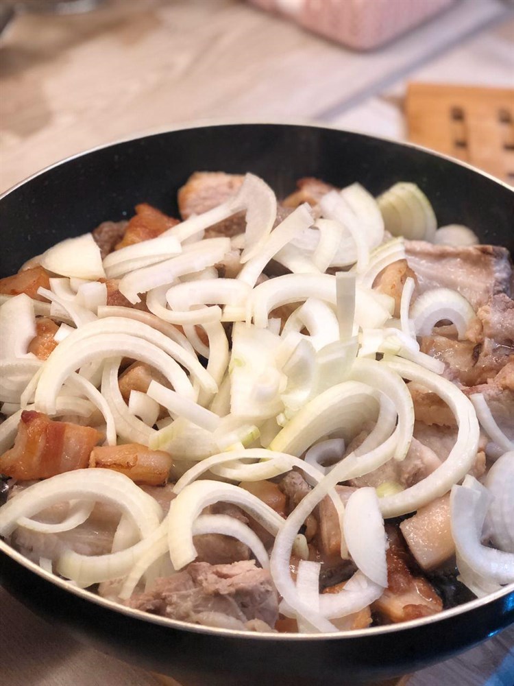 Для приготовления этого блюда нам понадобится кастрюля с толстым дном или казан. На дно кастрюли положим порезанное мясо и ребрышки и обжарим немного с луком.