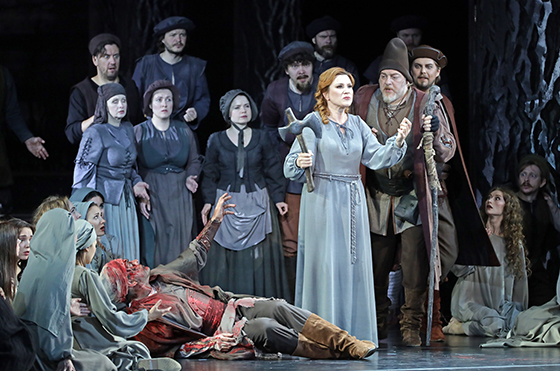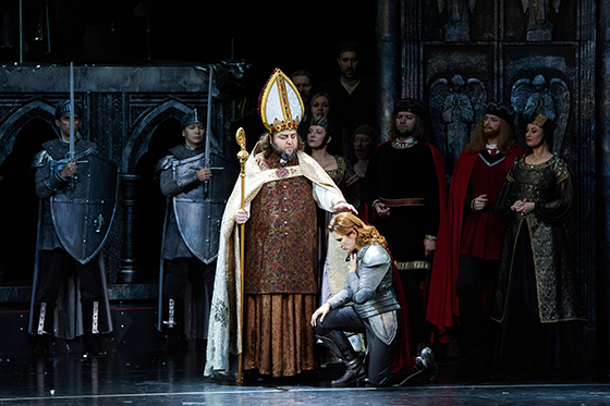 © Наташа Разина / Мариинский театр Для премьерных показов «Орлеанской девы» было подготовлено три состава певцов. Иоанну в первый вечер пела Екатерина Санникова, Агнесу Сорель — Ирина Чурилова. Во второй вечер на эти партии были выставлены «первачи»: Екатерина Губанова и Елена Стихина. Светлое и звонкое сопрано Стихиной летело в зал, без усилий пробивая толщу оркестрового звучания и хоровые массы. Еще одна удача спектакля — Алексей Марков / Лионель с роскошным баритоном и величавой повадкой. Голос его звучал благородно, вальяжно, объемно. К концу спектакля распелся и Евгений Никитин в роли Тибо д'Арка. Призывая громы и молнии на голову своей непутевой дочки, он был вполне убедителен — и сценически, и вокально.