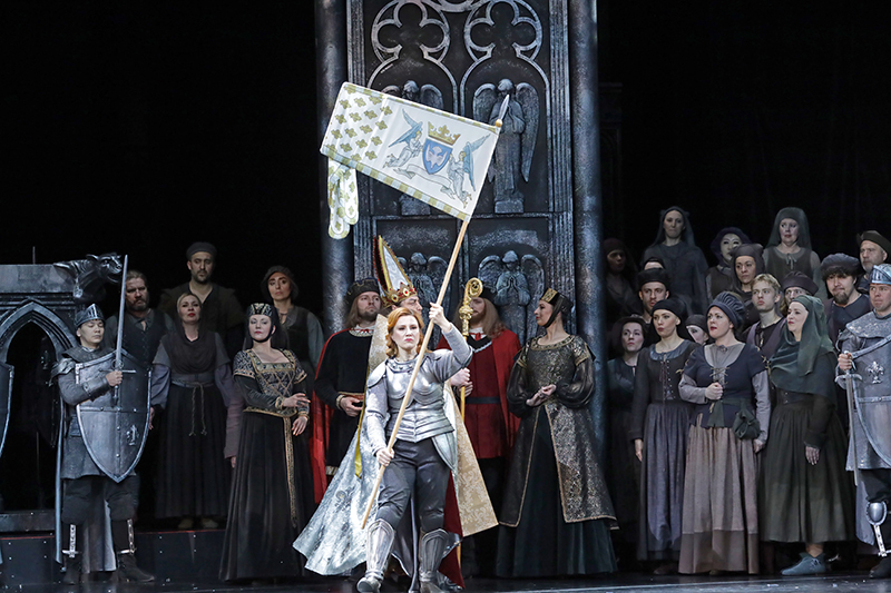 © Михаил Вильчук / Мариинский театр Тем не менее для режиссерской интерпретации сюжет оперы более чем благодарный. В нем есть мистика, возвышенность, героизм, трагедийный пафос, эффектные сцены коронационного шествия в Реймсский собор, лесного пожара и аутодафе. Жертвенность Иоанны д'Арк, ее мученический путь, отречение и смерть на костре превращают оперу почти в античную трагедию, в которой запечатлены вневременные смыслы и архетипы. Появления ангельских воинств, голоса, которые слышит только Иоанна, ее видения разверзшихся небес побуждают как-то отрефлексировать все это богатство, как-то соотнести сюжет из истории Столетней войны с нашим временем — тревожным и полным потерь, как личных, так и общественных.