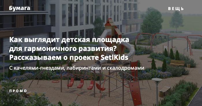 «SetlKids — территория умных и активных» — это проект детских площадок, созданный с учетом пожеланий психологов, детей и их родителей. Идею разработали вместе со специалистами из компании «Архитектура Будущего», которая занимается психологическим обучением детей, мам и пап. Некоторые элементы площадок площадок Setl Group установит во дворах ЖК Artline уже этим летом. Позже проект будет реализован в ЖК «Солнечный город», «Солнечный город. Резиденции» и «Зеленый квартал».