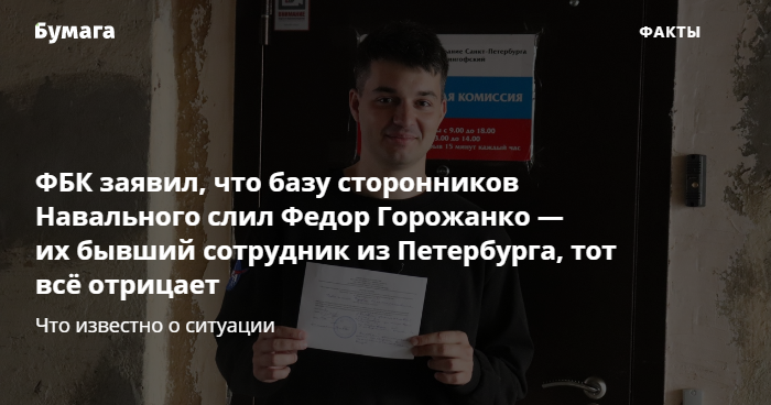 Фонд борьбы с коррупцией заявил, что базу данных с электронными почтами с сайта «Свободу Навальному!» украл их бывший сотрудник из Петербурга Федор Горожанко. За это он якобы получил более 1 миллиона рублей. Горожанко отрицает обвинение. «Бумага» рассказывает, что известно о ситуации и как на публикацию ФБК реагируют журналисты и активисты.