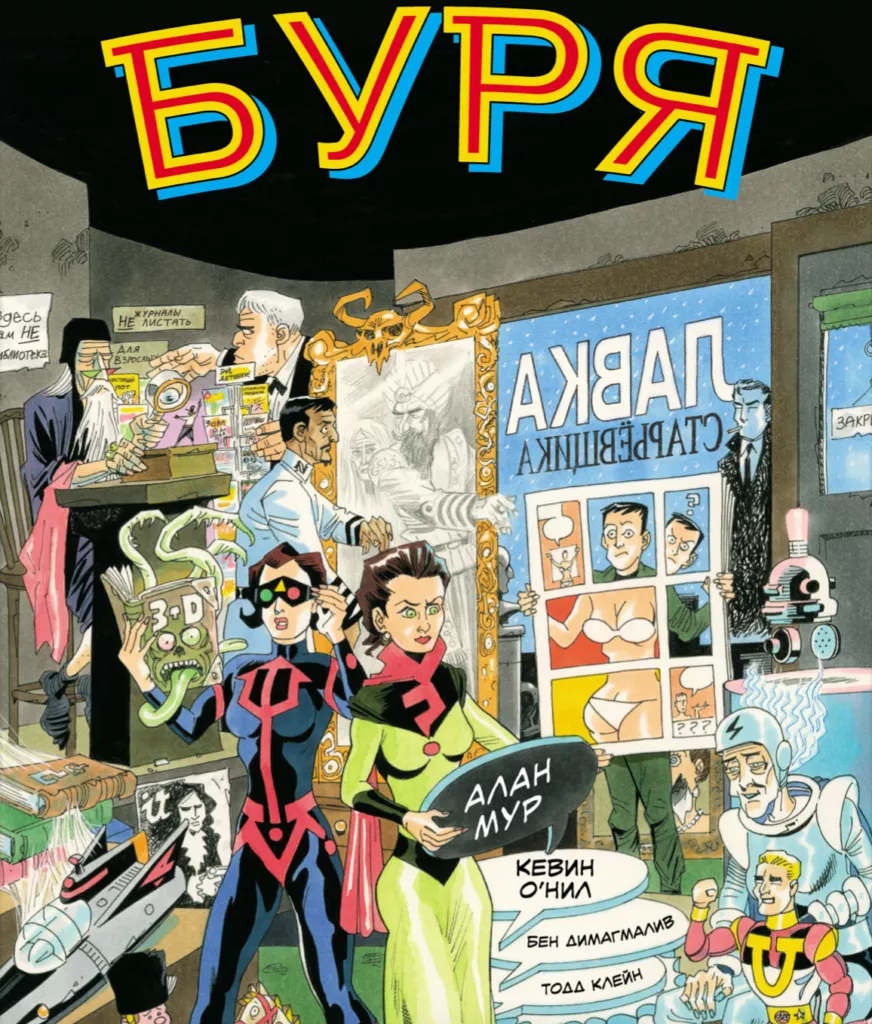 Во-первых, наряду с выжившими после всех джентльменских перипетий Мур вводит в сюжет персонажей, забытых всеми, кроме самых отчаянных коллекционеров британских комиксов 1960-х. И вводит практически с бухты-барахты: очевидная, но поначалу сильно сбивающая с толку пародия на давнюю практику мейнстримной супергероики. Большинство современных серий Marvel и DC (а также менее крупных издательств подобного рода) невозможно читать, не зная долгой их предыстории: без многочасового перелопачивания предшествующих тем или иным событиям выпусков читатель просто ничего не поймет. Читатель «Бури» оказывается в подобной ситуации; картинка «кто здесь кто и кому чего должен» складывается лишь после неоднократного перечитывания всех частей финала. Что вполне способно разъярить особо неусидчивую аудиторию, воспринимающую даже «альтернативный» комикс зачастую как легкий вариант эскапизма.
