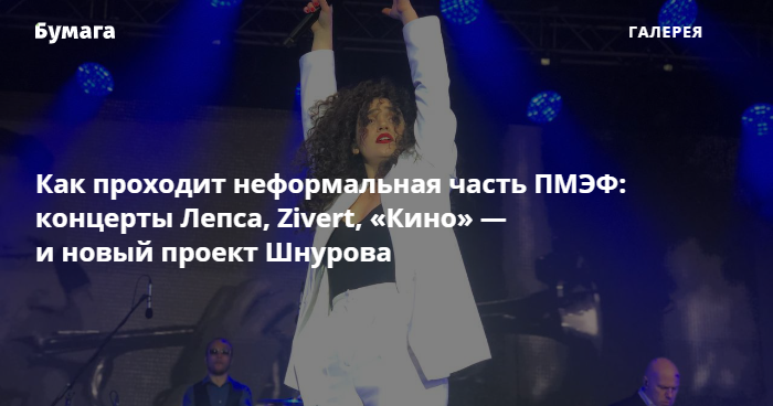 В Петербурге вечером 2 июня проходит неформальная часть Международного экономического форума. На разных площадках для участников выступают Григорий Лепс, Zivert и группа «Кино». Сергей Шнуров представил свой новый проект «Зоя» с вокалисткой Ксенией Руденко из Краснодара. «Бумага» показывает фото и видео с вечеринок.
