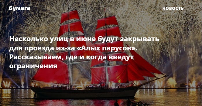Из-за праздника в июне частично будут ограничивать движение по Ремесленной улице от Петровского проспекта до дома 17, у Биржевой площади, у выезда с Кронверкского моста на Кронверкскую набережную. Узнать о правилах проезда подробнее можно в проекте распоряжения комитета по транспорту по ссылке.