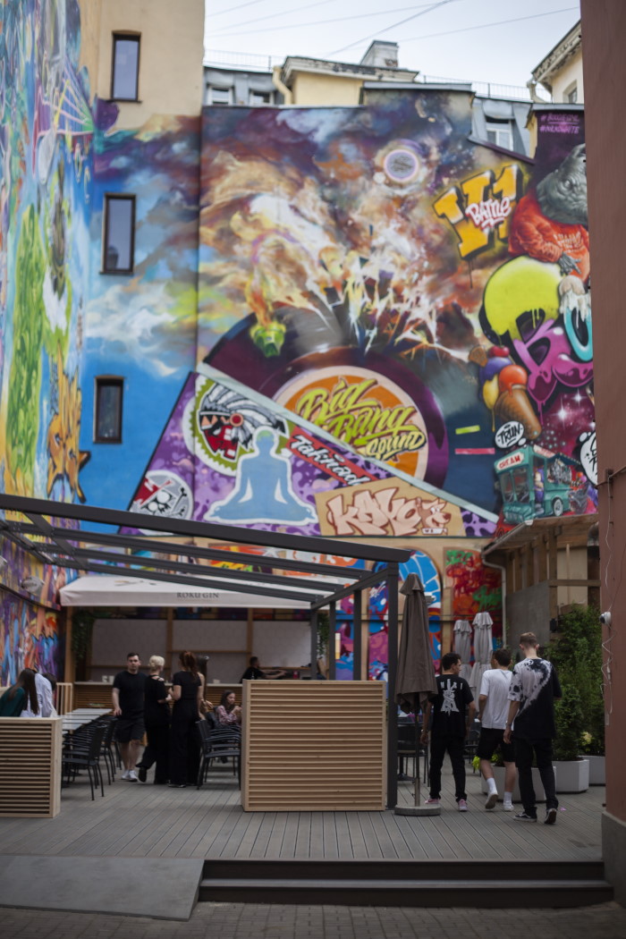 Мероприятия во дворе проводят уже сейчас, а официальное открытие площадки запланировано на 5 июня — в этот день уличные художники выступят со специальным перформансом, а вечером в пространстве будут играть диджеи. Более подробную информацию можно найти в инстаграме.