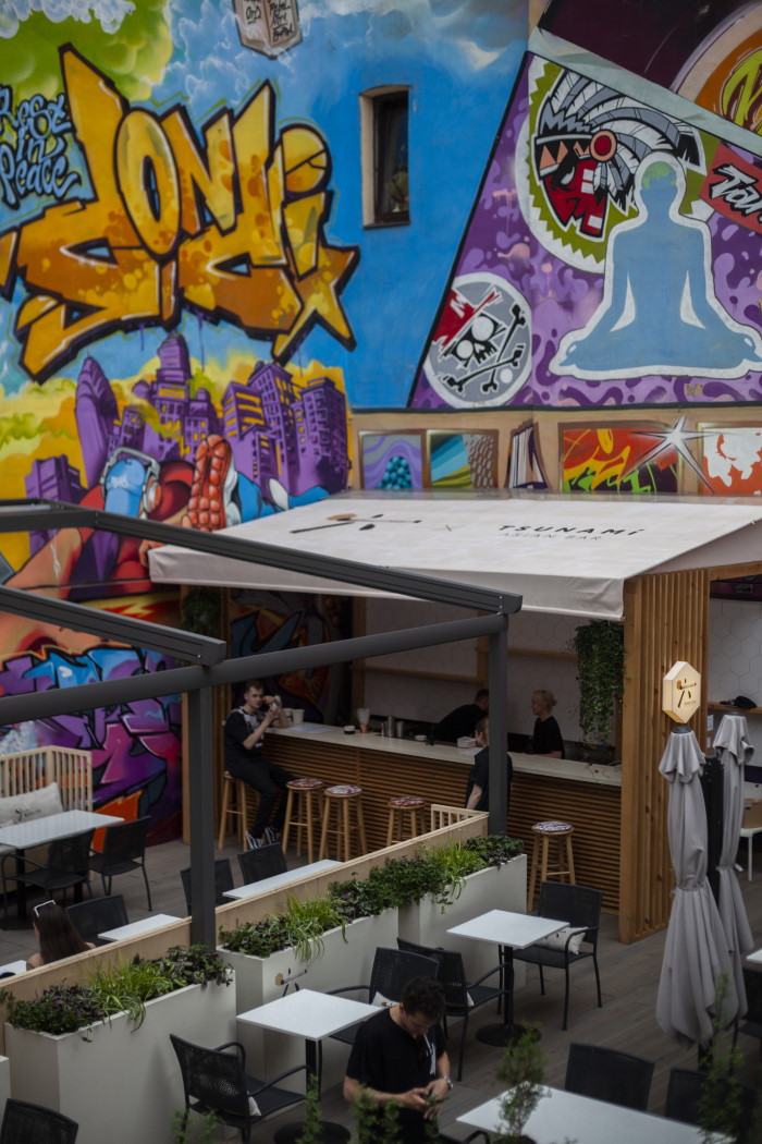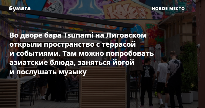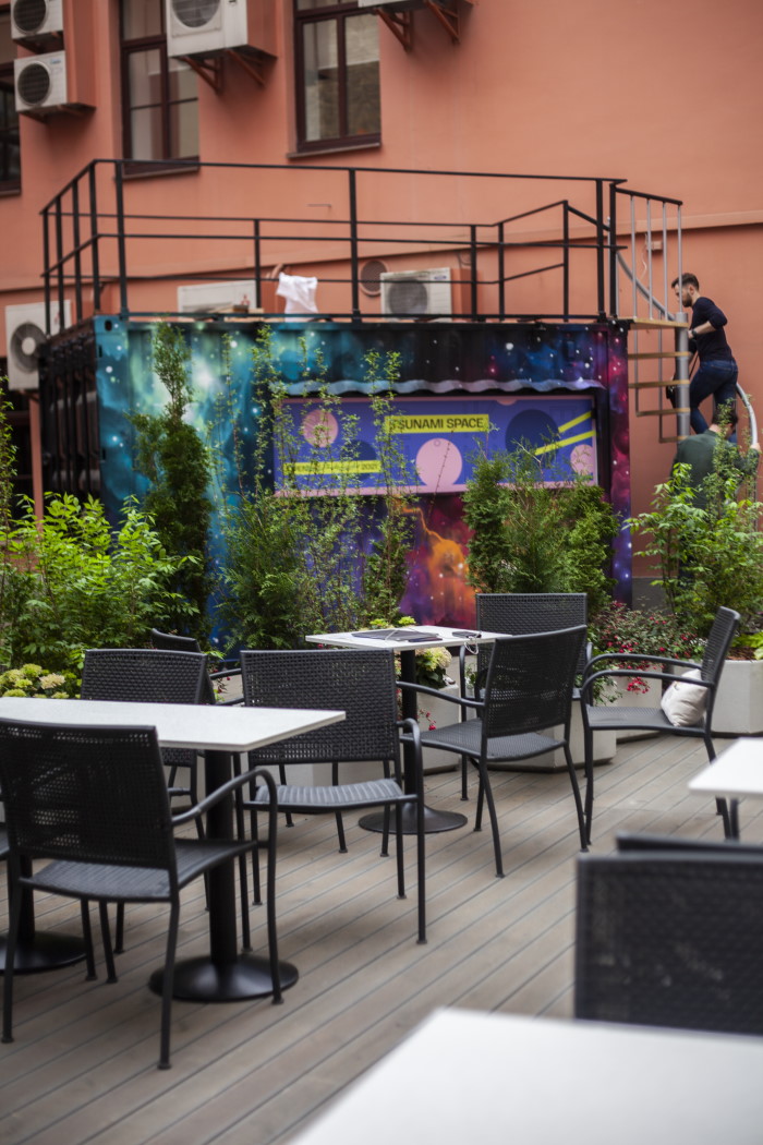 Во внутреннем дворе бара Tsunami на Лиговском проспекте, 39 открыли пространство Tsunami Space, сообщили «Бумаге» представители заведения. Во дворе установили террасу с крышей и озеленением, а стены домов расписаны граффити.