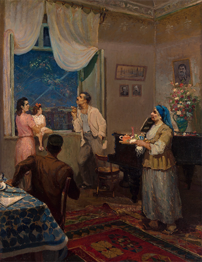 © Государственный музейно-выставочный центр «РОСИЗО» Абдул-Касум Салам-Заде (Саламов). Семья нефтяников наблюдает салют победы. 1948 — А какая проблематика для вас в данном случае важна? Разве не получается так, что, вычитая из пространства советского искусства тех авторов, которые поднимаются над духом времени, вы следуете логике исключения художников, не соответствовавших партийной цензуре. Ведь выставка приводит нас к общим выводам не о коллекции РОСИЗО, а именно о советском искусстве.