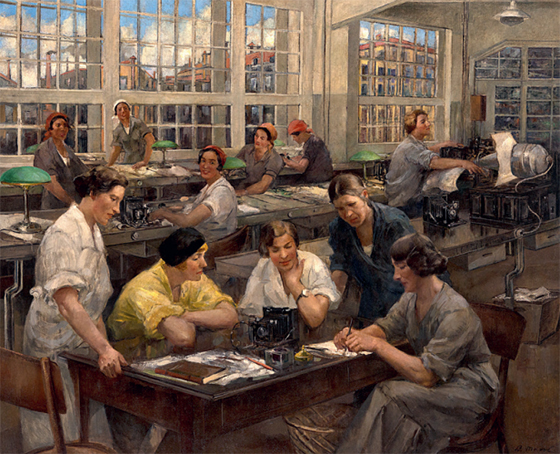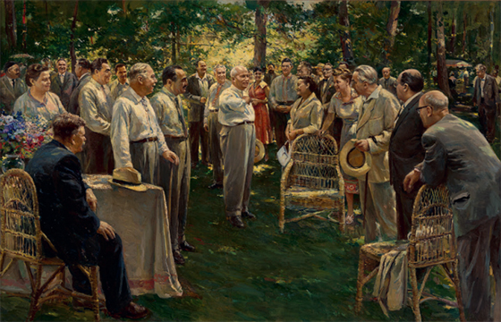 — Ну, например, унифицированные групповые портреты рабочих, которые показаны в огромных интерьерах заводских цехов. В них уже нет той живой социальной фактуры, что попадается в ранних работах АХРР, нет и фотореализма в духе Бродского. Это уже именно заказной материал середины 30-х годов, усредненная живопись, где художник, бывает, пишет все лица с одной модели. Как известно, такой стертый стиль был требованием партии, художников прорабатывали на собраниях, заставляли переделывать холсты.