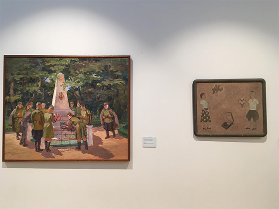 © Надя Плунгян Слева: Ерануи Асламазян. Бойцы Советской армии на могиле Бетховена. 1948Справа: Ринат Харисов. В шесть часов вечера после войны. 1984 — Но эти вещи как раз не из собрания РОСИЗО, как и, например, холст Николая Карахана в ориентальном разделе. Несмотря на подробные и очень добросовестно написанные тексты к разделам, многие сопоставления часто никак не объяснены, и остается ощущение, что работы таким образом дискурсивно уравнены, мы не понимаем дистанцию между ними. Мне запомнился момент в военном разделе, где показана небольшая по формату и совсем неизвестная работа Екатерины Зерновой, поразительная по эмоциональному напряжению, где группа солдат лежит в снегу возле горящего танка и один из последних сил бросает гранату, глядя сквозь зрителя, как герой «Смерти комиссара». А рядом с ней висит совершенно официозная картина 1948 года, изображающая опрятных и скромных советских воинов, которые коллективно возлагают цветы к могиле Бетховена.