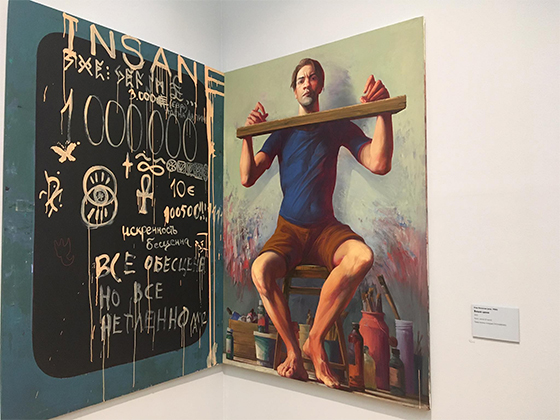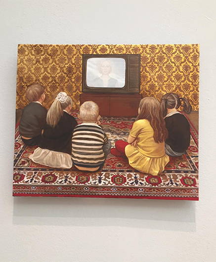— Я согласна. Единственный из приглашенных художников, кого я знала лично, — это Егор Кошелев, и что мне в нем и других участниках очень импонирует — они принимают всё это советское наследие, с большим уважением относятся ко многим художникам этого периода, много о них знают и видят именно как художники многое из того, чего не вижу я, они знают, как сделаны эти работы. И мне очень нравится их дистанцированная позиция аналитиков. Они принимают свое прошлое, они его изучают: например, в работах Павла Отдельнова есть археология, обладающая скрытой эмоциональностью, и из того, что представлено на выставке, его видео оказываются более живописными, чем холсты. В этих залах проходила выставка Раушенберга, и его работы с растром вступают в некий диалог и с этим искусством. Метатема Егора Кошелева — это проблема выбора, несвободы и хрупкости художника. Одна из главных работ в зале Владимира Потапова — его интерпретация темы прошлого с фрагментом рельефа парка Горького, который находится по соседству, а именно там проходили выставки «15 лет РККА» и «Пищевая индустрия». Меня впечатлило, как Потапов работает с поверхностью своих картин, и я бы назвала их картино-объектами: он довольно сложно выстраивает в них целые структуры из фрагментарных слоев памяти, и мне это очень интересно. Наконец, мне близки работы Маши Сафроновой, которая затрагивает любимую сегодня гендерную тему. Можно сравнить этих кормящих матерей Синицыной и сегодняшнюю женщину, работающую в офисе, уже в капиталистической системе. Думаю, эта тема универсальна, она не только про Россию. Вообще Маша — очень жесткий художник, и у нее много сюжетов о человеке, который находится в плену системы: есть и работы о детском одиночестве, о детях, сидящих перед телевизором.