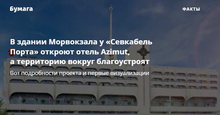 В здании Морвокзала у «Севкабель Порта» откроют отель Azimut, а территорию вокруг благоустроят. Вот подробности проекта и первые визуализации