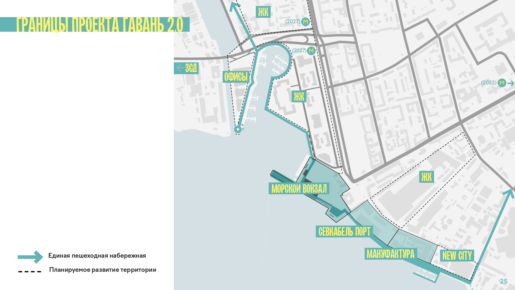 Это часть реновации промышленных набережных западной стороны Васильевского острова «Гавань 2.0». Авторы проекта планируют соединить площадь Морской Славы и Балтийский завод пешеходной набережной.