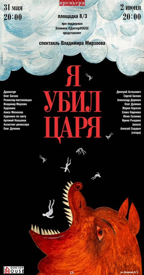 Жаль только, что актерский состав неровный. Ярче всех блистает Елена Коренева (официантка, пудель Джой, репортер), она остра, гротескна, парадоксальна и эмоционально раскалена. Очень хорош Олег Дуленин (Ипатьев, Юровский, царь) — сдержанный, тонкий и глубокий. Остальных просто перечислю в алфавитном порядке, как дает программка — Дмитрий Асташевич, Сергей Беляев, Александр Доронин, Мария Карлсон, Юлия Салмина — и отмечу, что для первого спектакля это был на самом деле отличный уровень. Особенно — имея в виду, что «живьем» и полным составом репетировали всего четыре дня, а до того репетиции шли в зуме (наше время не дает о себе забыть).