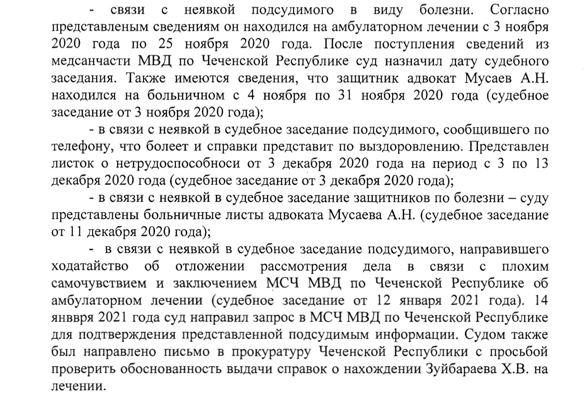 Через месяц они получили за подписью председателя горсуда, которая объясняла причины столь частых переносов: рассмотрение откладывалось из-за карантина в связи с коронавирусом, из-за отказа потерпевших от особого порядка, из-за занятости адвокатов в других процессах, дважды из-за болезни защитника Алауди Мусаева и четырежды — из-за заболеваний самого подсудимого.
