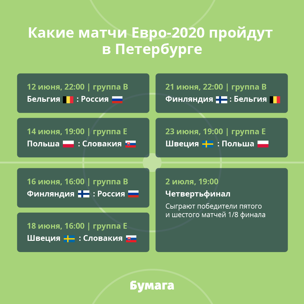 Петербург примет семь матчей чемпионата Европы. Это игры группы B между сборными России, Бельгии и Финляндии и перенесенные из Дублина игры группы Е между Швецией, Польшей и Словакией. На Крестовском также пройдет один матч четвертьфинала.
