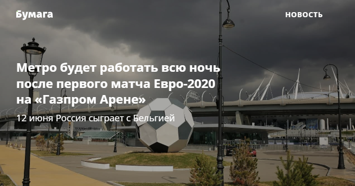 Метро будет работать всю ночь после первого матча Евро-2020 на «Газпром Арене». 12 июня Россия сыграет с Бельгией