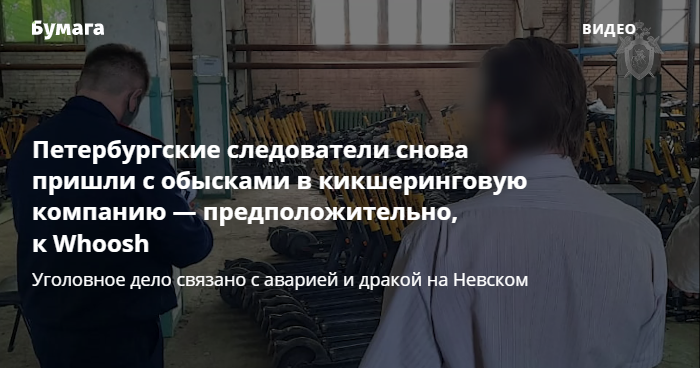 СК опубликовал видео, на котором видны электросамокаты, похожие на продукцию Whoosh. Ранее представители компании подтверждали, что именно на их электросамокатах ехали молодые люди, врезавшиеся в пешеходов и устроившие драку. В пресс-службе Whoosh не смогли оперативно ответить на вопросы «Бумаги».